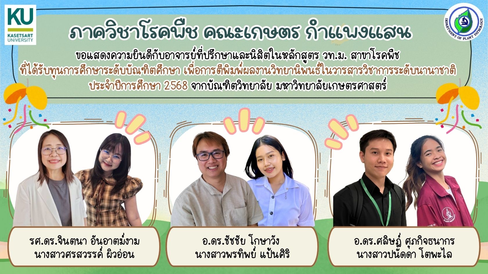 ขอแสดงความยินดีกับอาจารย์ที่ปรึกษาและนิสิตในหลักสูตร วิทยาศาสตรมหาบัณฑิต สาขาโรคพืช ที่ได้รับทุนการศึกษาระดับบัณฑิตศึกษา เพื่อการตีพิมพ์ผลงานวิทยานิพนธ์ในวารสารวิชาการระดับนานาชาติ ประจำปีการศึกษา 2568 จากบัณฑิตวิทยาลัย มหาวิทยาลัยเกษตรศาสตร์