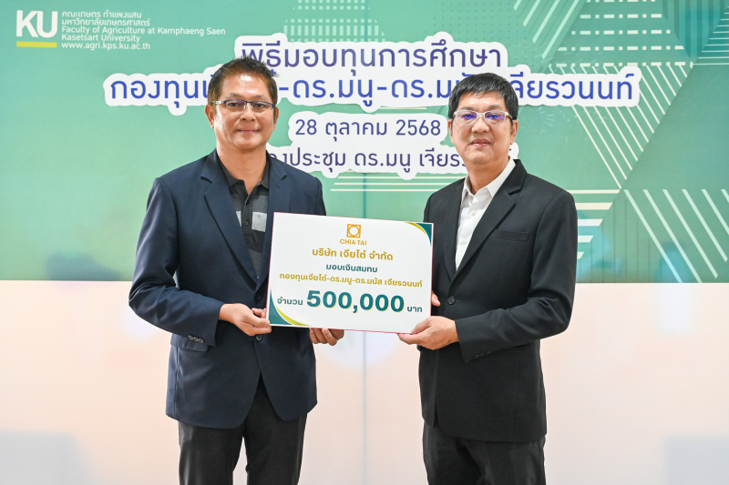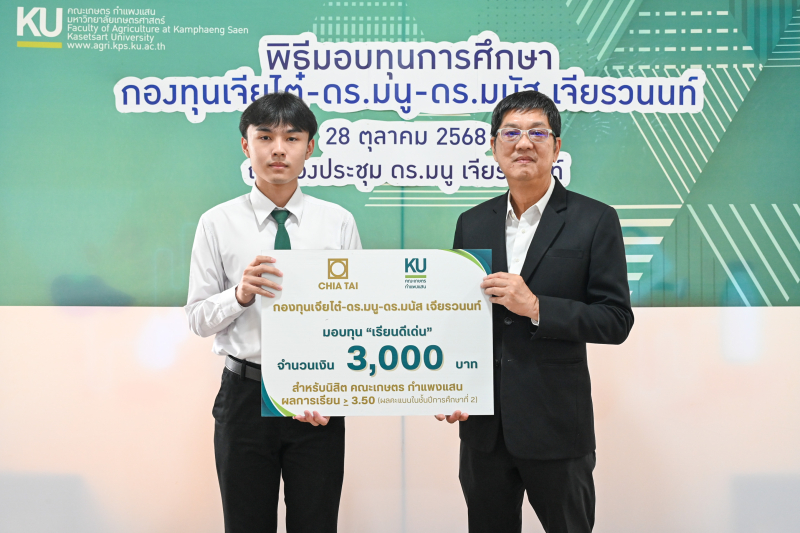 เวลา 16.00 น. ได้มีพิธีมอบทุนการศึกษา กองทุนเจียไต๋-ดร.มนู-ดร.มนัส เจียรวนนท์ สำหรับนิสิตคณะเกษตร กำแพงแสน ประจำปีการศึกษา 2568 โดย ผู้ช่วยศาสตราจารย์ ดร. ชัยสิทธิ์ ทองจู คณบดีคณะเกษตร กำแพงแสน กล่าวขอบคุณ บริษัท เจียไต๋ จำกัด และให้โอวาทแก่นิสิต คุณทวีสุข เมฆธวัชชัยกุล Chief Commercial Officer บริษัท เจียไต๋ จำกัด ได้กล่าวถึงความเป็นมาของกองทุนฯ ให้โอวาทแก่นิสิต และมอบเงินสมทบเข้ากองทุนเจียไต๋-ดร.มนู-ดร.มนัส เจียรวนนท์ จำนวน 500,000 บาท